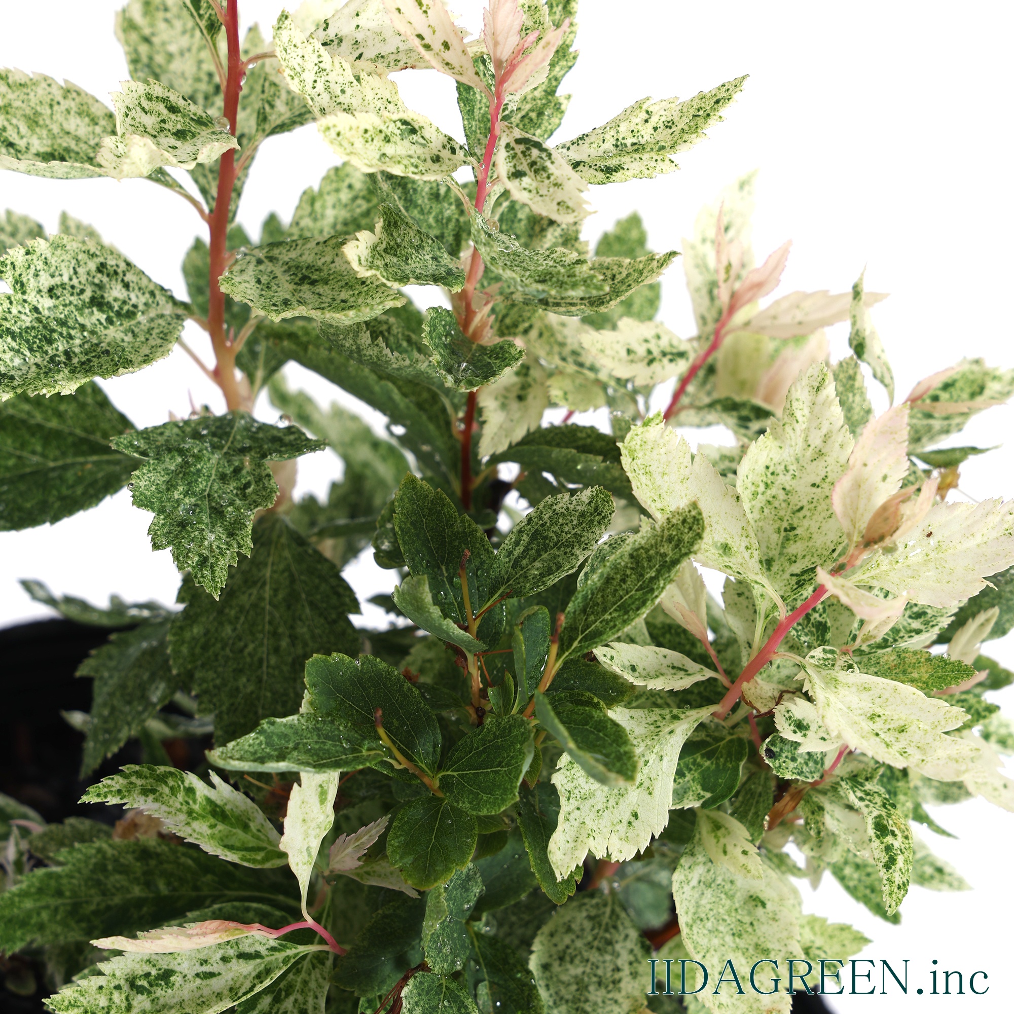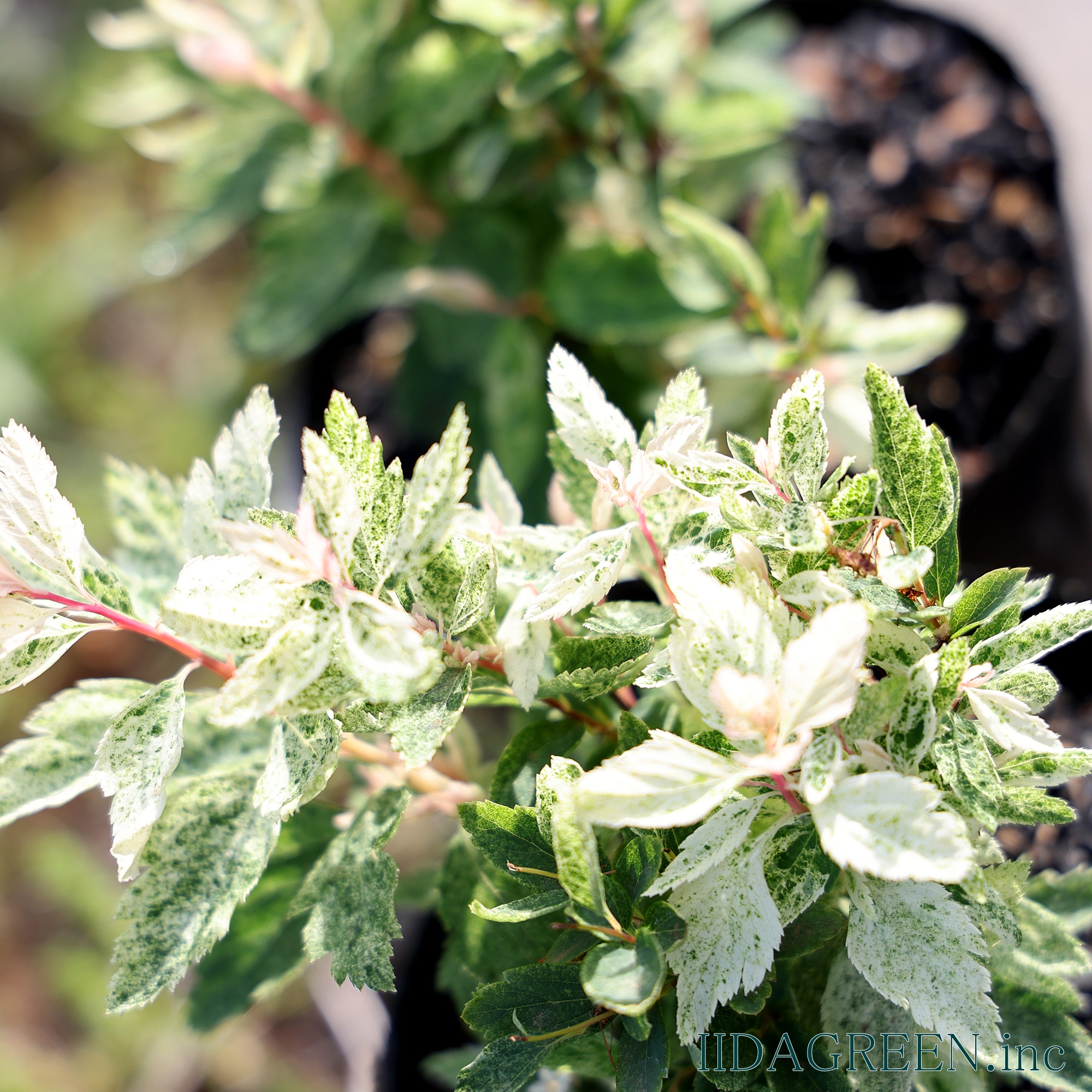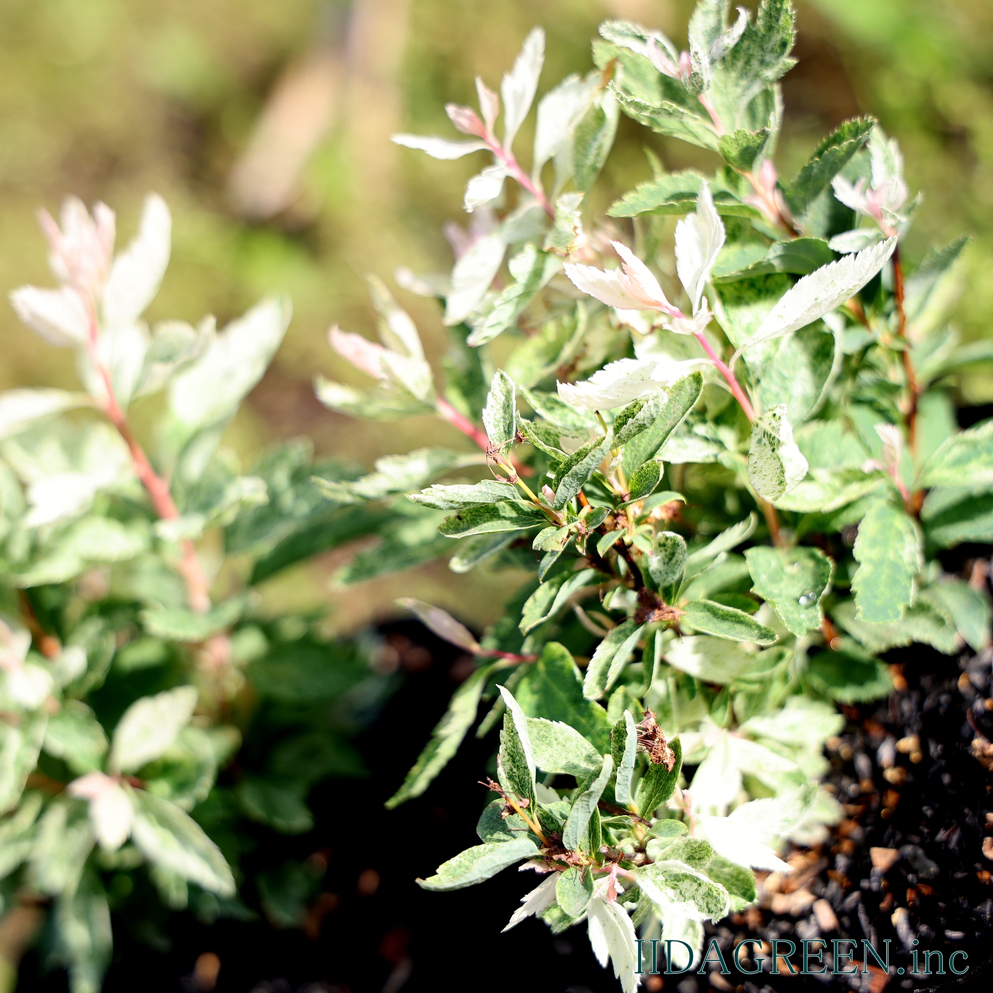 特徴と魅力 古くから親しまれているコデマリの園芸品種で、新芽の時期にピンクや白の斑が入り、雪が降ったような繊細な模様が葉全体に広がるのが最大の特徴です。成長とともに斑の色味が落ち着き、爽やかな白斑へと変化していく様子は、お庭に明るさと軽やかさをもたらしてくれます。 葉の色味や質感が魅力で、単体での鑑賞はもちろん、寄せ植えのアクセントとしても空間を華やかに演出します。また、しなやかに伸びる枝を活かして、足元をふんわりと覆うようなグランドカバー的な使い方もでき、庭の主役にも脇役にもなる汎用性を持っています。